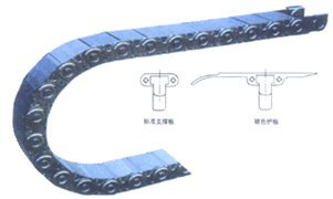 TLG 型钢制拖链可承载数量多,重量大的电缆及油管,自由悬置(允许不用支承轮)长度大,支撑板可依顾客需要制作,适用于工作母机,移动机械等。其弯曲半径为50-600mm,链板高度为35-150mm,可任意选用。